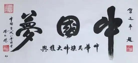 “中国梦”三个大字以行书挥就,笔势酣畅淋漓,墨色浓淡相宜,既有雷霆万钧之力,又不失灵动飘逸之姿。右侧“习近平题”的落款与“中华民族伟大复兴”的小字题跋,更让这幅作品承载了时代的重量。左侧“中国当代八奇怪才张玉杰”的署名与红色印章,彰显出艺术家的个性与身份,也使其成为连接传统与现代的文化符号。