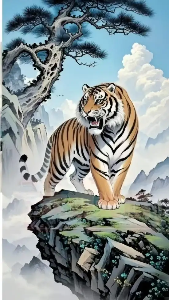 这幅《猛虎图》堪称视觉与精神的双重震撼。老虎立于悬崖之巅,利爪紧扣岩石,虎口微张似有虎啸震山谷,连身旁的古松都在气浪中微颤。在中国文化里,虎从来不只是“百兽之王”这般简单——它是驱邪避凶的瑞兽,是勇猛精进的象征。