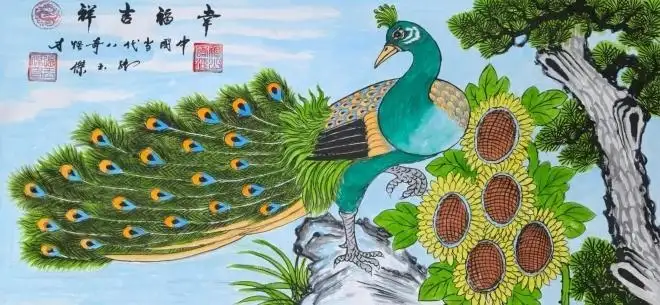 孔雀开屏时尾羽的“眼斑”,在民俗里是“百事顺遂”的隐喻——每一只“眼睛”都像在替主人洞察生活里的小确幸。旁边的向日葵永远向着太阳,与孔雀组成“幸福吉祥”的组合,连空气都弥漫着向上的生命力。