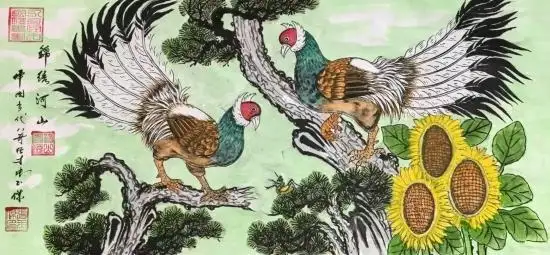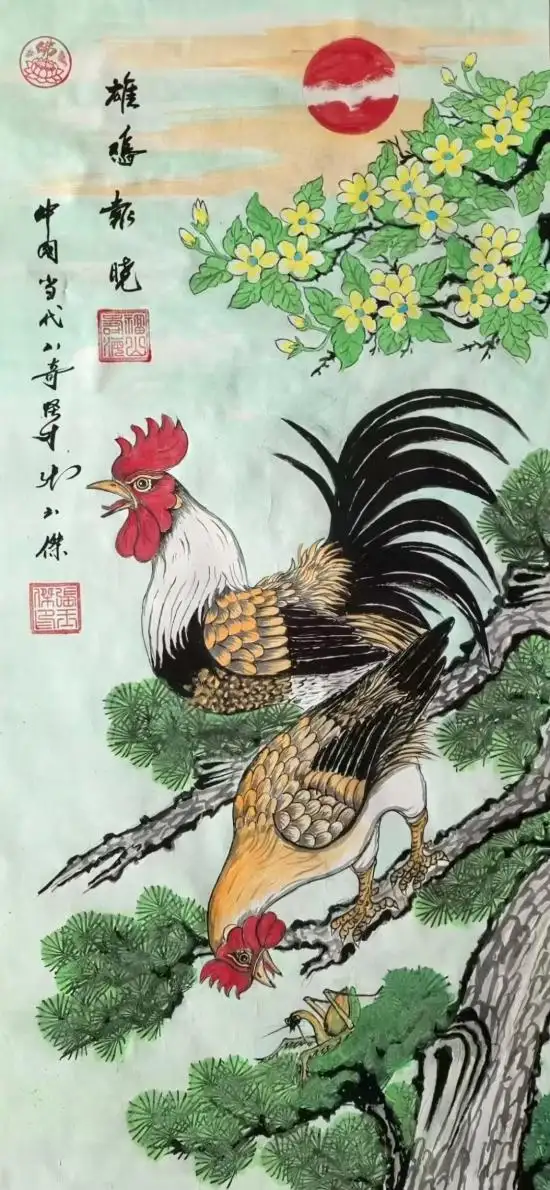 画中,一只雄鸡昂首挺立于松枝之上,红冠高耸,目光炯炯,仿佛正引颈高歌,唤醒黎明。。旁侧母鸡低头觅食,神态悠然,与雄鸡的昂扬形成动静对比,更添生活气息。背景中,红日高悬,金黄的花朵簇拥绽放,松针苍翠,螳螂点缀其间,整个画面洋溢着蓬勃生机与祥和之气。
