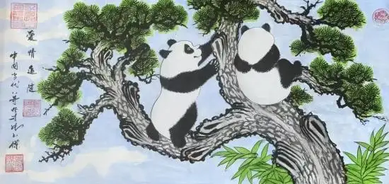 如果说其他画作是“大气磅礴”,那《爱情追随》就是国画里的小清新。两只熊猫在松树枝桠间嬉闹,一只笨拙地往上爬,一只圆滚滚地坐着,像极了爱情里互相追随的两个人。松树的“长青”属性,又给这份浪漫加了“长久”的肯定。